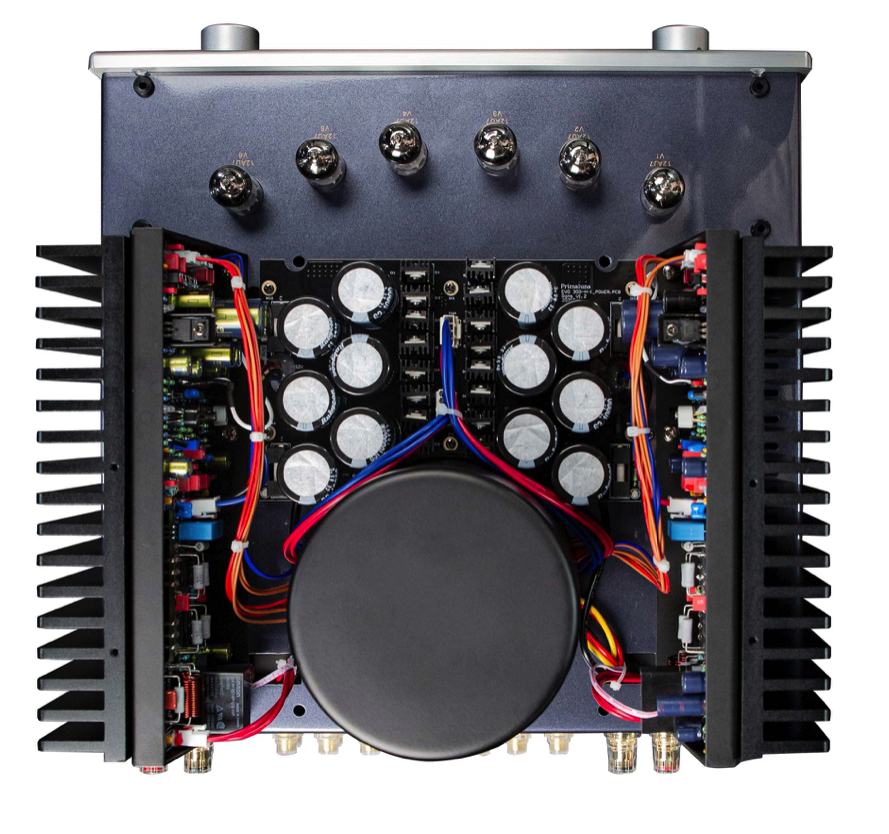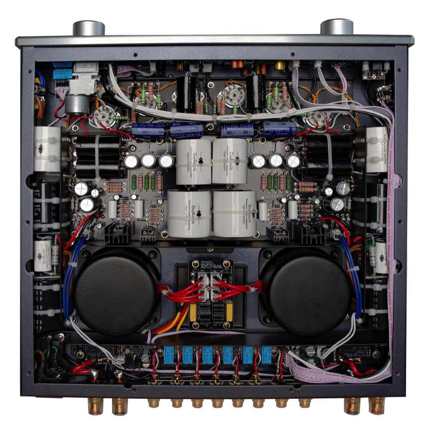 - De buizenvoorversterkertrap bevat twee voedingen met aparte transformatoren; de solid-state vermogenstrap maakt gebruik van een speciale 500VA-transformator.